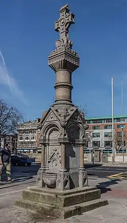 At the northern end of the street stands the Sheahan Memorial from 1906, which commemorates the place where a member of the Dublin Metropolitan Police, Constable Patrick Sheahan, died on duty. The memorial was designed by W. P. O'Neill, built by Harrison & Sons,[14] and was moved to the side of the street in 2012.[15] Its inscription reads, in English and Irish:[16][17]