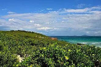 Hawks Nest is a long (16.5 kilometres (10.3 mi)), thin (typically 1.7 km (1.1 mi)), coastal town running northeast to southwest and is about 220 km (137 mi) north of Sydney, 12 km (7.5 mi)) from the Pacific Highway. It is bordered by the Tasman Sea to the east, the Myall River to the west and Port Stephens to the south. It includes Yacaaba, the northern headland of Port Stephens, which rises to 210 metres (690 ft) above mean sea level. However, the rest of the town is generally low, flat, sandy and covered in coastal scrubland, with some bushland, resulting in the northern part of the suburb being accessible only by four-wheel drive vehicles until the 1980s.[5][7]