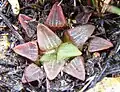 It can be distinguished from its Haworthia relatives, by its rounded leaf tips and its dark colour.