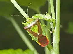 The hawthorn shield bug (Acanthosoma haemorrhoidale) is a common European shield bug.[1] Its chief food is haws, the fruit of the hawthorn tree, but adults can overwinter on a diet of leaves, and individuals can be found on many potential food plants, including pedunculate oak, sessile oak and whitebeam.[2] They may grow up to 17 mm (0.67 in) long, and are camouflaged in shades of green and brown. Like many so-called "stink bugs", they may release unpleasant odours when disturbed.[3]