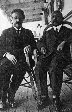 In October 1922, on his return voyage to Japan after his third visit to Europe, Miyake met theoretical physicist Albert Einstein. During the trip, Einstein suffered from bloody diarrhea and fever, and his wife, Elsa, asked Miyake for help. Miyake reassured the worried Einstein, who feared a possible cancer, and quickly cured him of a tropical fever with medication.[8] Einstein and Miyake became friends.[1] When their ship arrived in Kobe, Einstein promised to visit the surgeon at his home in Fukuoka. He fulfilled this promise on 25 December of the same year.[11] During the visit, Einstein played the piano brought by Miyake from Vienna.[3] The scholars also corresponded with each other.[4]