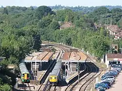 On 3 September 1883 the Lewes and East Grinstead Railway opened a branch line from Copyhold Junction, just north of the station, to Horsted Keynes railway station on their existing line between those towns.[5] There was an intermediate station at Ardingly.[1] As a result, Haywards Heath station was enlarged by the provision of two bay platforms. As soon as the line was opened, the Lewes and East Grinstead Railway merged with the London Brighton and South Coast Railway, but until 1912, there was no physical connection between the tracks of the branch line and those of the main line; they ran parallel all the way to Haywards Heath station.[6] Once the connection was made, it provided a relief route for the congested Brighton Main Line from Croydon to Brighton via Oxted, East Grinstead and Haywards Heath. This double-track branch line was closed to passengers on 28 October 1963, but a single-track section remains to serve a freight and aggregates terminal at Ardingly.[1]
