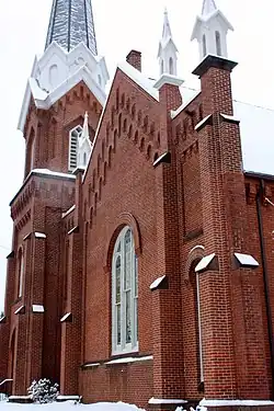 The historic district encompasses a section of Hazard Avenue (Connecticut Route 190 and adjacent roads, as well as a now-parklike section of the banks of the Scantic River, where the operations of the Hazard Powder Company were located. The district is dominated by four public buildings constructed of brick with brownstone trim: a public school, the Hazardville Institute, the former St. Mary's Episcopal Church, now incorporated as Holy Trinity Episcopal Church,[3] and the Hazardville United Methodist Church.[2]: 33–34 The school and the institute are both of Italian Renaissance Revival design and were built in 1864 and 1869, respectively. The Episcopal church is a Gothic Revival structure built in 1863. The Methodist church, built in 1872, is in the Romanesque Revival style.[2]: 29