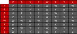 2nd Character (Letter): The second character for the EAC for each of the three substances is Y, S and W. The correct character to use may be determined with the chart on the right. Taking the Y along the top row of the chart, and the S along the left hand column, the intersection is at Y and therefore the character for the first two substances would be Y. This resultant character (Y) is then taken along the top row and the character for the third substance (W) is taken along the left hand column. The intersection point is now W. The second character of the code for the three substances is therefore W.