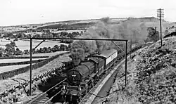 At the station, the line fell in the Sheffield direction on a gradient of 1 in 124 (0.81%).[6] The station was built in stone with the main buildings on the Sheffield-bound (Up) platform and a waiting shelter on the other. A high signal box of the Manchester, Sheffield and Lincolnshire Railway's early type, almost square with hipped roof, controlled the station and the entry to the branch line which served the Hepworth Iron Company's works at Crow Edge.