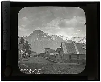 In 1891, Richard S. Sargent arrived, becoming a leading figure in the community.[36] That year, the HBC SS Caledonia was the first steamboat to navigate the Kitselas Canyon and reach Hazelton.[37] However, both high and low water made the canyon impassable, limiting navigation to three months per year.[38] Sargent was the inaugural government postmaster 1899–1927[39] and opened a trading post in 1900.[40]