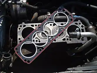 Its purpose is to seal the combustion gases within the cylinders and to avoid coolant or engine oil leaking into the cylinders.[1] Leaks in the head gasket can cause poor engine running and/or overheating.