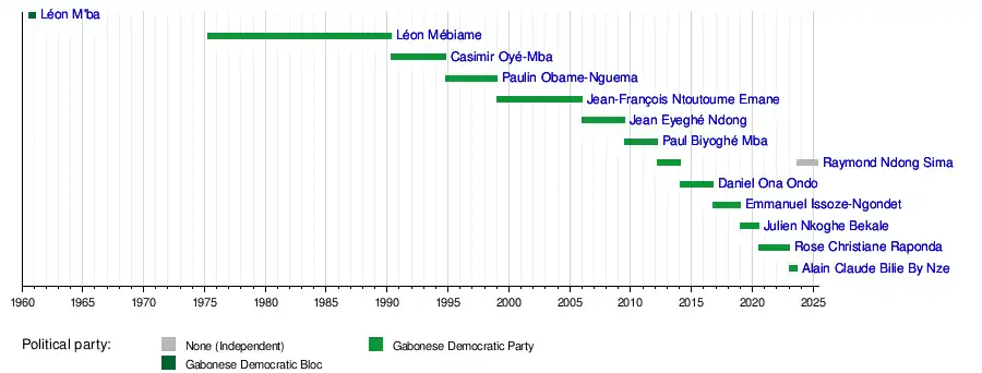 - ^ The office of Prime Minister existed while the autonomous Gabonese Republic was part of the French Union/French Community (21 May 1957 – 17 August 1960).
