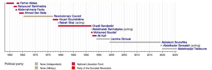 Abdelmadjid TebbouneAbdelkader BensalahAbdelaziz BouteflikaLiamine ZéroualAli KafiMohamed BoudiafAbdelmalek BenhabylesChadli BendjedidRabah BitatHouari BoumédièneRevolutionary Council (Algeria)Ahmed Ben BellaAbderrahmane FarèsBenyoucef BenkheddaFerhat Abbas