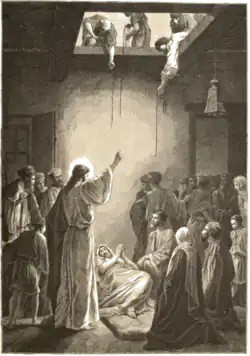 Healing the paralytic at Capernaum is one of the miracles of Jesus in the synoptic Gospels (Matthew 9:1–8, Mark 2:1–12, and Luke 5:17–26).[1][2][3][4] Jesus was living in Capernaum and teaching the people there, and on one occasion the people gathered in such large numbers that there was no room left inside the house where he was teaching, not even outside the door. Some men came carrying a paralyzed man but could not get inside, so they made an opening in the roof above Jesus and then lowered the man down. When Jesus saw how faithful they had been, he said to the paralyzed man, "Son, your sins are forgiven."