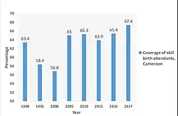 This increase in the coverage of live births by skilled birth attendants from the year 2000 in Cameroon could be attributed to the increase in the number of training institutions of health owned by the government, faith-based organization and also by private individuals; and also increase in the number of skilled health personnel employed in health facilities. Moreover, possibly because of the increase in mother and child health campaigns and demand to seek health this services in health facilities though traditional birth attendants are also present.[5]