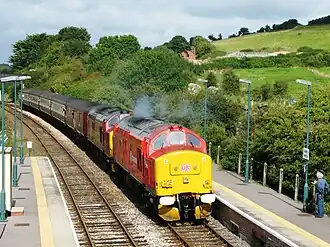 ![]() Class 37s at Maiden Newton with a summer Saturday Bristol-Weymouth service in 2009 | |||