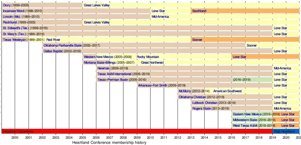 - 2019 - The Heartland ceased operations as an athletic conference after the 2018-19 academic year; as many schools left to join their respective new home primary conferences beginning the 2019-20 academic year: Arkansas–Fort Smith (UAFS), Dallas Baptist, Lubbock Christian, Oklahoma Christian, St. Edward's (Tex.), St. Mary's (Tex.) and Texas A&M International (TAMIU) joined the Lone Star to renew their rivalries with Texas–Permian Basin and Western New Mexico; while Newman (Ks.) and Rogers State joined the MIAA to renew their rivalries with Lincoln (Mo.); and men's soccer affiliates Eastern New Mexico, Midwestern State, Texas–Permian Basin (UTPB) and West Texas A&M returned to their primary home conference once the Lone Star began to re-sponsor the sport.