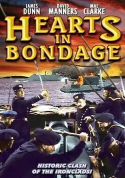 Hearts in Bondage is a 1936 American black-and-white war drama film directed by Lew Ayres for Republic Pictures. Set during the American Civil War, the film depicts the Union Navy's deliberate sinking of USS Merrimack, the Confederate States Navy's salvage and refitting of the ship as the ironclad CSS Virginia, the Union Navy's development of the ironclad USS Monitor to counter Virginia, and the subsequent engagement of the two vessels in the Battle of Hampton Roads. It also features many historical characters, including United States President Abraham Lincoln, Secretary of the Navy Gideon Welles, and Confederate States President Jefferson Davis. The fictional plot, starring James Dunn, Mae Clarke, and David Manners, pits two friends and future brothers-in-law on opposite sides of the North–South conflict, dividing their families and threatening their survival. Hearts in Bondage is notable as a rare example of a Hollywood film to depict the naval battles of the American Civil War.