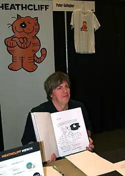 Heathcliff is an American comic strip created by George Gately in 1973,[2] featuring the title character, an orange cat. Now written and drawn by Gately's nephew, Peter Gallagher, it is distributed to over 1,000 newspapers by Creators Syndicate, which took over the comic from McNaught Syndicate in 1988.[3][4]