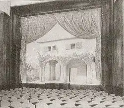 Oskar Kaufmann aimed for a strict separation of stage and auditorium by designing the stage frame similar to a picture frame. This funnel-shaped proscenium promotes the impression of a peep-box stage and was to become a characteristic feature of Kaufmann's architecture. With the almost square format of 12 m height as well as width of the opening, the play on stage appears as a framed picture, thus completely spatially separating the dramatic action from the audience hall.[12]: 124 The spacious stage house (19 × 16 × 14 m) included a novel revolving stage with a diameter of 12.3 metres. Kaufmann's concept also included musical and opera performances. The first rows of stalls in the auditorium could be removed and the cavity beneath them used as an orchestra pit.[12]: 128