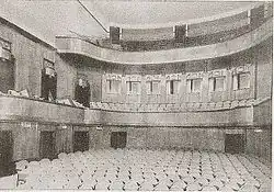 The auditorium is in a reduced two-aisle layout. Here, the second tier is not completely brought forward to the stage space in order to provide all spectators with the best viewing conditions and to prevent a distorted view of the stage.[1]: 81 The tail shape of the balustrade is characteristic of Kaufmann's architecture and was also used as a single-aisle system in the Berlin Renaissance Theatre and the Kaliningrad Regional Drama Theatre in Königsberg. The two cylindrical towers on either side of the stage, each housing stairs, match the curved tiers. The 800-seat auditorium is almost entirely covered with reddish to golden-brown stained panels of birch wood and was originally additionally decorated with valuable silk fabrics. The monotony of a usual rank theatre is avoided by rounding off the ramps. The wooden panelling, which was made by the company E. E. Lehmann,[12]: 124 extends up to the second tier and also includes the two towers.[12]: 124 This cladding creates the uniform impression of the room, which is deliberately not broken up by the installation of rear boxes behind the first tier and thus represents Kaufmann's decisive innovation in comparison with other theatre constructions of the time. The ceiling is unadorned and without the "obligatory" chandelier.[12]: 124