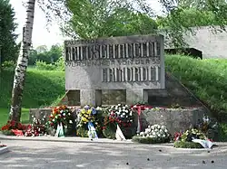 In 1964, a memorial stone created by the artist Will Elfers and donated by the Dachau Camp Community (Lagergemeinschaft Dachau) was set up in front of the bullet traps. After a short time there, the Ministry of Finance transferred this memorial to the entrance gate of the shooting range.[6]