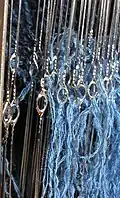 A heddle or heald is an integral part of a loom. Each thread in the warp passes through a heddle,[1] which is used to separate the warp threads for the passage of the weft.[1][2] The typical heddle is made of cord or wire and is suspended on a shaft of a loom. Each heddle has an eye in the center where the warp is threaded through.[3] As there is one heddle for each thread of the warp, there can be near a thousand heddles used for fine or wide warps. A handwoven tea-towel will generally have between 300 and 400 warp threads[4] and thus use that many heddles.