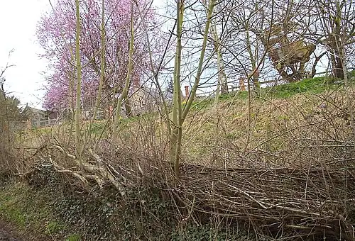 Hedgelaying (or hedge laying) is the process of partially cutting through and then bending the stems of a line of shrubs or small trees, near ground level, without breaking them, so as to encourage them to produce new growth from the base and create a living ‘stock proof fence’.[1] It is a countryside skill that has been practised for centuries, mainly in the United Kingdom and Ireland, with many regional variations in style and technique. The first description of hedgelaying is in Julius Caesar's Commentaries on the Gallic War,[2] when his army was inconvenienced by thick woven hedges during the Battle of the Sabis in Belgium. Hedgelaying developed as a way of containing livestock in fields, particularly after the acts of enclosure which, in England, began in the 16th century. Today hedges are laid to contain livestock without the need for artificial fences, maintain biodiversity-friendly habitats, promote traditional skills and because of the pleasing visual effect of a laid hedge.[3][4]