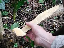 In Devon, hedgelaying is usually referred to as steeping. The pleachers are known as steepers. They are held in place by crooks (forked sticks driven into the centre of the hedgebank).[4] The two sides of the hedge are steeped separately (as long as the hedge is big enough) leaving a gap through the centre of the hedge. When steeping is finished any eroded soil is cast up on top of the hedge to retain a good height of bank.