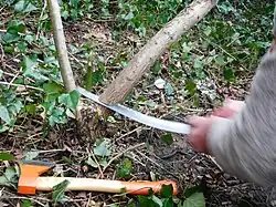 The theory behind laying a hedge is easy. The practice is much harder, requiring skill and experience. The aim is to reduce the thickness of the upright stems of the hedgerow trees by cutting away the wood on one side of the stem and in line with the course of the hedge. This being done, each remaining stem is laid down towards the horizontal, along the length of the hedge.[6]