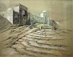 On a sketching trip to Spain Churchward first made his acquaintance with Islam. He was awed by the Alhambra in Granada and the stunning architecture of the Córdoba Mosque, developed a liking for the landscape of Al-Andalus, and determined to travel to Morocco. He became steeped in Arab culture, gradually exchanging his western clothing for local garb and announcing to his family that he had adopted Islam.[13]