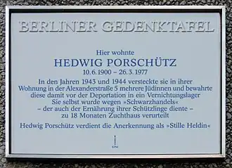 - ^ "Stille Heldin geehrt - Berliner Gedenktafel für Hedwig Porschütz". berlin.de (Press release) (in German). 3 November 2011. Archived from the original on 28 October 2019. Retrieved 28 October 2019.