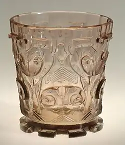 Hedwig glasses or Hedwig beakers are a type of glass beaker originating in the Middle East or Norman Sicily and dating from the 10th–12th centuries AD. They are named after the Silesian princess Saint Hedwig (1174–1245), to whom three of them are traditionally said to have belonged.[1] So far, a total of 14 complete glasses are known.[2] The exact origin of the glasses is disputed, with Egypt, Iran and Syria all suggested as possible sources; if they are not of Islamic manufacture they are certainly influenced by Islamic glass.[3][4] Probably made by Muslim craftsmen, some of the iconography is Christian, suggesting they may have been made for export or for Christian clients.[5] The theory that they instead originate from Norman Sicily in the 11th century was first fully set out in a book in 2005 by Rosemarie Lierke, and has attracted some support from specialists.[6]