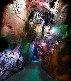 There are two caves at the Heights of Abraham, the Great Masson Cavern and the Great Rutland Cavern, both previously mined for lead ore and fluorspar. It is thought that lead mining in this area began in Roman times and reached its peak in the 1700s. As deposits began to dwindle, and cheaper lead was imported in the 1800s, the miners found a far more lucrative use for the caves as tourist attractions; in the process of excavation a large network of caverns and passageways were created which wealthy visitors would now pay to see. There are regular guided tours to retrace the miners' footsteps with a nearby exhibition of photography, fossils and an information film, explaining the cave's history.[2][4]
