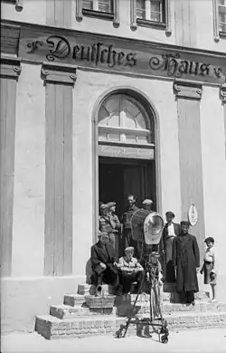 Back home, the acts of violence against the German minority continue to increase: Marie's father too becomes the victim of a Polish attack and is blinded as a result; the wife of innkeeper Ludwig Launhardt, Martha, dies after being struck by stones thrown by Poles. When during the Invasion of Poland the German villagers meet secretly in a barn, in order to hear Hitler's speech of 1 September 1939 before the Reichstag, they are discovered, arrested and imprisoned. Marie keeps up their spirits with the promise that they will escape, that Germans are deeply concerned about them, and that they will be able to return home and hear neither Yiddish nor Polish, but only German.[3] They are abused by the prison guards, but escape through an underground cellar and, scarcely avoiding a massacre, are saved by invading Wehrmacht soldiers. The German escapees ready for their resettlement into the "homeland", while widowed Ludwig Launhardt asks for Marie's hand. At the end of the film the German trek crosses the border into the Reich. The conclusion shows an enormous picture of Hitler set up at the checkpoint.