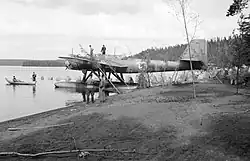 In response to the rising tensions in Europe, the Norwegian Ministry of Defence had ordered six He 115Ns for the Royal Norwegian Navy Air Service (RNoNAS) on 28 August 1939 and the aircraft were delivered from 14 July – 13 November 1939.[14] The He 115N order was intended to replace the RNoNAS fleet of 1920s vintage Douglas DT torpedo bombers and the obsolescent Marinens Flyvebaatfabrikk M.F.11, which was the mainstay of the RNoNAS in 1940.[15] The Norwegians signed another order of six He 115Ns in December 1939, with delivery expected in March/April 1940 but this was forestalled by Operation Weserübung, the German invasion of Norway of 9 April 1940.[14] At the outbreak of hostilities, the RNoNAS had six He 115Ns in service (F.50, F.52, F.54, F.56, F.58 and F.60) spread along the coast from the naval air stations at Sola and Flatøy in the south to the one at Skattøra Naval Air Station outside Tromsø in the north. At the beginning of the German invasion, the aircraft at the seaplane base at Hafrsfjord near Stavanger (F.60) was captured by the Germans, but two Luftwaffe He 115s (given the codes F.62 and F.64 in Norwegian service) were seized by an improvised militia unit of Norwegian riflemen at Ørnes in Glomfjord, Nordland and by police officers at Brønnøysund, Nordland. The two aircraft were seized after they ran out of fuel and had to make emergency landings on 10 April. Manned by Norwegian aircrews, they served against their former owners for the duration of the campaign.[12]