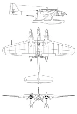 In terms of its general configuration, the He 115 was an all-metal mid-wing monoplane with a monocoque fuselage.[4] It was equipped with a pair of floats, each of which was attached to the underside of the engine nacelles via a large strut. The twin-spar wing was built in three sections.[4] It featured a stepped cockpit along with a rear-facing observation compartment.[5] Initially, the He 115's armament consisted of two 7.92 mm (.312 in) MG 15 machine guns, one in the nose and one in the dorsal position.[2] On later-build He 115s, the typical armament fitted included a fixed forward-firing 15 mm or 20 mm MG 151 cannon and two rearward-firing 7.92 mm (.312 in) MG 17 machine guns in the engine nacelles.[6][7] Furthermore, some variants carried LTF 5 or LTF 6b torpedoes and SD 500 500 kg (1,100 lb) or SC 250 250 kg (550 lb) bombs, while others carried LMB III or LMA mines.