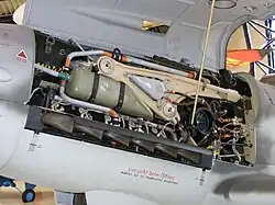 During development, the anticipated weight of the He 177 increased so much that a main undercarriage design sufficient to handle the 32 metric tons (35 short tons) loaded weight, was difficult to achieve. The engine nacelles and wings had little room for the main undercarriage members, which needed to be longer than usual, for ground clearance for the large diameter four-blade counter-rotating propellers. After several extremely complex arrangements had been considered during initial design, a novel system was adopted. Instead of a wheel leg under each engine nacelle, two-wheel legs were attached to the main spar at each nacelle, the outboard legs retracting upward and outward into shallow wing wells and the inboard legs swinging upward and inward into similar wells in the wing roots, with all units enclosed by flush fitting wheel and strut doors, which almost met under each engine nacelle when fully extended. During the retraction cycle, the forward-oriented lever-action lower gear strut sections (onto which the wheels were mounted on their axles), pivoted backwards to a 90° angle from 120° when fully extended. This was in order to position the wheels to fit into the wheel wells during the sideways folding action.[16] A conventional rearwards-retracting single-leg twin wheel arrangement for each main gear, a design heavily influenced by the He 219's similar main gear components, was used on the two prototypes built (one during the war, one post-war) of the He 274 in France. Drawings were made for a tricycle gear arrangement for the four-BMW 801E radial-engine powered Amerikabomber entry version of the proposed He 277 by February 1943, which was also depicted with single main gear struts with twin wheels.[17] For the He 177A's own landing gear maintenance needs, some two hours were required just to change a main gear tire, using special Heinkel-designed 12 metric tons (13 short tons) capacity main gear jacks and blocks.[18]