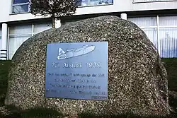 On 27 August 1939, the aircraft performed its maiden flight, only days before Germany invaded Poland.[8][9] This flight, piloted by Erich Warsitz, lasted only six minutes and almost ended in near-disaster due to a misjudgement during the unpowered landing approach, but was successfully recovered.[10] Warsitz later described his groundbreaking flight: "I moved the throttle levers gently forward. As the aircraft began to roll I was initially rather disappointed at the thrust, for she did not shoot forward as the 176 had done, but moved off slowly. By the 300-metre mark she was moving very fast. Despite several attempts I could not retract the undercarriage. It was not important, all that mattered was that she flew. The rudder and all flaps worked almost normally, the turbine howled. Now I would have to take my chances with the landing, losing altitude by side-slipping. I restored her to the correct attitude just before touching down, made a wonderful landing and pulled up just short of the Warnow."[11]