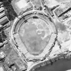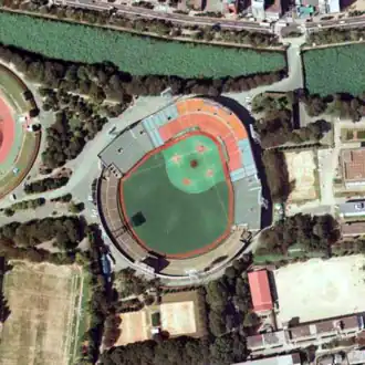 After World War II, the former site of Fukuoka Castle and later the 24th Infantry Regiment of the 12th Division of the Imperial Japanese Army was requisitioned by the Supreme Commander for the Allied Powers (SCAP) to construct dormitories. Heita Okabe, the chairman of National Sports Festival preparation committee, however, negotiated with SCAP to abandon the plan and instead allow a sports ground to be built on the site. In 1948, Maizuru Park was established and Heiwadai Athletic Stadium was developed in the park to host the 3rd National Sports Festival that same year from October 29 to November 3.[2] The name heiwadai (平和台, 'peace hill') was chosen to commemorate the site's transformation into a place of peace.[3] In March 1949, the city council passed a proposal to build a ballpark in Heiwadai. A soccer field would be redeveloped and construction of the stadium started on July 1.[2] The stadium was simple and its stands consisting of only wood benches placed atop a dirt mound.[4] It cost ¥30 million to construct. Later that same year, on December 18, the stadium hosted its first event, an exhibition game between the Yomiuri Giants and the Osaka Tigers.[2]