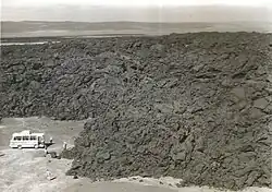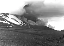 The 1970 eruption of Hekla started at 9:23 pm on 5 May 1970 and lasted until 5 July. It had a VEI of 3 and produced 0.2 km3 (0.048 cu mi) of lava covering an area of 18.5 km2 (7.1 sq mi) and 6.6×10 7 m³ of tephra, deposited over an area of 40,000 km2 (15,000 sq mi), mainly to the northwest of the volcano.[17]