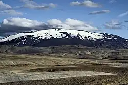 Hekla is a popular destination for hiking. Following the most recent eruption the path goes most of the way to the summit;[56] the walk takes 3 to 4 hours.[9] In spring, skiing is possible on short routes around the rim of the crater. In summer, there are easy (F) mountaineering routes also around the crater rim,[57] and it is possible to snowcat to the top in winter. The volcano can be reached using the buses to Landmannalaugar 30 km (19 mi) further east, and it is possible to stay or camp at farms in the area.[58] A visitor centre, The Hekla Center at Leirubakki Farm, opened in 2007.[59]