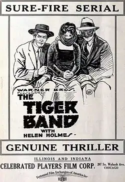 In 1919 and 1920, she made only one film each year and only two in each of the next three years. During those years she not only starred in, but also produced, a serial film by the Warner Brothers called The Tiger Band (1920).[14] Between 1924 and 1926, Helen Holmes made eighteen more short adventure films, but her popularity began to wane in a market over-saturated with female cliffhanger films. Holmes made several Westerns opposite actor and rodeo performer Jack Hoxie in the mid-1920s.