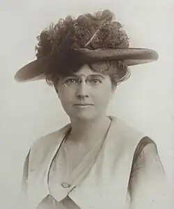 In January 1907, Harriot Stanton Blatch founded the Equality League of Self-Supporting Women, emphasizing a militant, aggressive form of activism in support of women's enfranchisement. Helen Hoy was an early member of this organization that sought membership from professional women like Hoy in addition to large numbers of unionized and working-class women.[8] By 1908 the League's membership included Hoy, Charlotte Perkins Gilman, Florence Kelley, Leonora O'Reilly, Lavinia Dock, Jessie Ashley, Gertrud Barnum, Inez Milholland, and Rose Schneiderman.[9] After the sixtieth anniversary celebration of the Seneca Falls Convention, Hoy joined a "trolley car campaign" organized by Blatch and Maud Malone, traveling throughout New York and ending near Vassar College.[10] Led by Milholland, several members of the League including Hoy, Blatch, Gilman and Schneiderman participated in what would become an infamous pro-suffrage gathering of Vassar students at a cemetery near the campus, as the campus president had forbidden suffrage gatherings on school grounds.[10]