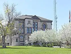 Helena's early commercial district was located along State, Edwards, and Broadway Streets, but fires destroyed much of this area in 1869, 1872, and 1874. Much of what was built afterwards was built in the Western Commercial style, with splendid brickwork and simple lines. The Beaux Arts Parchen Drug Building, Colwell Building, and the Penn-Block Bristol Hotel were French Renaissance. The Denver Block and Sands Brothers Dry Goods were Romanesque Revival.[3] By the mid-1880s at least 18 architectural firms had been established in Helena or called in from back East. Several of these architects were part of or influenced by the Chicago school of architecture. This influence is seen in the Atlas Building, Securities Building, Power Block, and the Lewis and Clark County Courthouse.[5]