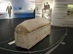 Helena moved to Jerusalem, where she is buried in the pyramidal tomb which she had constructed during her lifetime, three stadia north of Jerusalem.[13] The catacombs are known as "Tombs of the Kings." A sarcophagus bearing two inscriptions was found there, the funerary epigram reading in Aramaic Ṣaddān Malkaṯā (Palmyrene: 𐡲𐡣𐡭 𐡬𐡫𐡪𐡶𐡠), and Ṣaddā Malkaṯā (צדה מלכתה), interpreted by scholars to mean: "Our mistress, the Queen."[14][15]