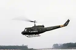 Helicopter Transport Wing 64 was established at Penzing Air Base in Bavaria on 1 October 1966 when personnel and equipment of three of the Air Force's helicopter SAR and liaison squadrons as well as parts of the Pilot Training School "A" were merged. No. 1 Training, Test and Transport Squadron was based at Fürstenfeldbruck Air Base, No. 2 SAR Squadron was stationed at Penzing Air Base, and No. 3 SAR Squadron at Faßberg Air Base. In May 1968, No 4. SAR Squadron was formed, also based at Penzing Air Base.[1] Until 1968 the wing flew a variety of aircraft, amongst which were helicopters of the types Bristol Sycamore, Bell 47, Piasecki H-21 and Alouette II but also Dornier Do 27 fixed-wing aircraft.[2] From February 1968 until May 1969 the introduction of the Bell UH-1D took place, replacing all other aircraft previously flown by Helicopter Transport Wing 64.[3] In 1968, two squadrons of the wing were redeployed to Diepholz Air Base in Lower Saxony to form the 2nd Flying Group, only to be relocated to Ahlhorn Air Base in April 1971 when Air Transport Wing 62, the previous occupant of the air base, was disbanded. Three squadrons of Helicopter Transport Wing 64 were stationed at Ahlhorn Air Base[4] with No 1 Squadron remaining at Penzing Air Base.[5] With the disbanding of Air Transport Wing 62 and the incorporation of some of its helicopters and personnel into Helicopte Transport Wing 64, the wing was equipped with 78 helicopters.[6] When the air force's helicopter training school at Faßberg Air Base was closed in 1975, the task of training new helicopter pilots was for a time assigned to Helicopter Transport Wing 64 which had a flight simulator at its disposal in one of the airbase's hangars.[7] Flight training of helicopter pilots subsequently took part at Fort Rucker, Alabama, United States.[8] The wing also incorporated the helicopters of the former training school into its squadrons. This meant that the wing had a capacity of almost 120 helicopters.[9] In the following years, various helicopters of Helicopter Transport Wing 64 were stationed at a number of locations in northern and central Germany to fulfil their SAR role, such as at the military hospital in Koblenz,[10] and the airbases at Jever and Faßberg. The wing also provided helicopters for SAR centres at Rheine Air Base[11] and Hamburg.[12] Still stationed at Penzing Air Base, No. 1 Squadron became subordinate to Air Transport Wing 61 in 1979.[13]