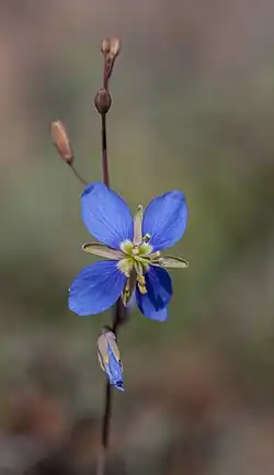 Flowers, which are blue or mauve in colour, are most common between August and October.[2] They have four round petals with basal appendages surrounding a white center and a yellow stamen.[2][3] While one appendage per petal is most common, they may rarely have two.[4] They contain 20-52 ovules.[2] The flowers are only open when it is warm, and will close when the environment cools.[3]