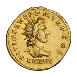 Helios is usually depicted as a handsome young man crowned with the shining aureole of the Sun, which traditionally had twelve rays, symbolising the twelve months of the year.[34] Beyond his Homeric Hymn, not many texts describe his physical appearance; Euripides describes him as ρυσωπός (khrysо̄pós) meaning "golden-eyed/faced" or "beaming like gold",[35] Mesomedes of Crete writes that he has golden hair,[36] and Apollonius Rhodius that he has light-emitting, golden eyes.[37] According to Augustan poet Ovid, he dressed in tyrian purple robes and sat on a throne of bright emeralds.[38] In ancient artefacts (such as coins, vases, or reliefs) he is presented as a beautiful, full-faced youth[39] with wavy hair,[40] wearing a crown adorned with the sun's rays.[41]