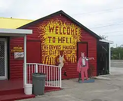 Regardless of how it first came to be called Hell, the name stuck and the area has become a tourist attraction, featuring a fire-engine red hell-themed post office from which you can send "postcards from hell", and a gift shop with "Satan" Ivan Farrington[1] passing out souvenirs while greeting people with phrases like "How the hell are you?" and "Where the hell are you from?"[2]