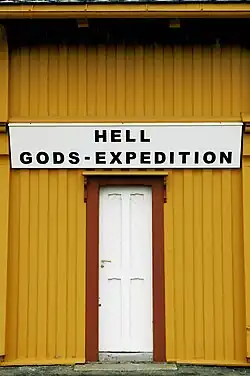 The station's freight building still bears the old sign saying Hell Gods-Expedition. In Norwegian, Gods-Expedition (archaic) or godsekspedisjon (modern) means freight service or cargo handling.[6] This sign is a popular photo opportunity for foreign English-speaking tourists. Especially in the summer months, it is not unusual for foreigners, when discovering the sign, to disembark the train in order to get a photo. The building is not used for freight anymore. All light freight is handled through post offices or competing companies.