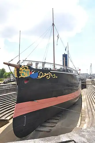 In about 1880, the dimensions of the dry dock were given as 71 m long, with an entrance at Amsterdam Ordnance Datum water level of 15.90 m wide. The blocks were 0.75 m high. If water was 0.1 m above AOD, the caisson door could be opened, and a ship with a draft of 4.45 m could enter the dock. This was not counting the tide.[15] The fact that the dry dock nowadays serves ships of 3.75 m draft at +0 m AOD,[16] suggest that the block height of 75 cm still had to be deducted from the 4.45 m, leading to a possible draft for docking ships of 3.70 m without tide in 1880.