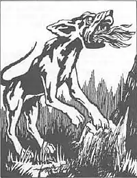 The gwyllgi (compound noun of either gwyllt "wild" or gwyll "twilight" + ci "dog") is a mythical black dog from Wales that appears as an English mastiff with baleful breath and blazing red eyes.[15]