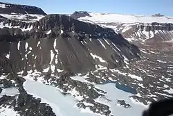 The cover rocks in the Helliwell Hills are Permian Beacon sediments and Jurassic Ferrar sills. The basement has low- to high-grade metamorphic rocks as well as pegmatite and granites.[2] There is a fairly continuous transition from low to high grades in the metarnorphic rocks. This is evidence for intense local heat during metamorphism.[3] The degree of metamorphism, deformation and pegmatite formation increases greatly from east to west in the hills. The phyllites at the lowest level in the east of Boggs Valley are similar to the rocks of the Morozumi Range, with simple deformation. Further west the deformation is more polyphase, and at least three phases of folding can be recognized in the west.[4]